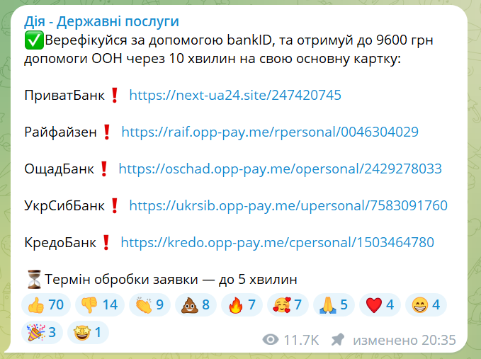 “Насправді застосунок “Дія” нікому і нічого не виплачує. На порталі державних послуг користувачі можуть подати електронну заявку на отримання допомоги (якщо ця опція доступна у вашому регіоні), а рішення щодо нарахувань ухвалюють державні органи. Виплати відбуваються винятково через державні фінустанови — “ПриватБанк”, “Ощадбанк” тощо”, — пояснюють у Центрі стратегічних комунікацій, та закликають всіх бути уважними, критично ставитися до будь-якої інформації, аналізувати.
