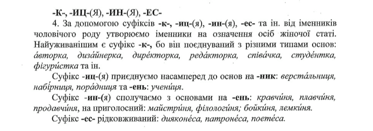 У новій редакції правопису є окремий пункт, присвячений утворенню фемінітивів. Жіночі форми іменників утворюватимуться за допомогою суфіксів -к, -иц(я), -ин(я) та -ес.