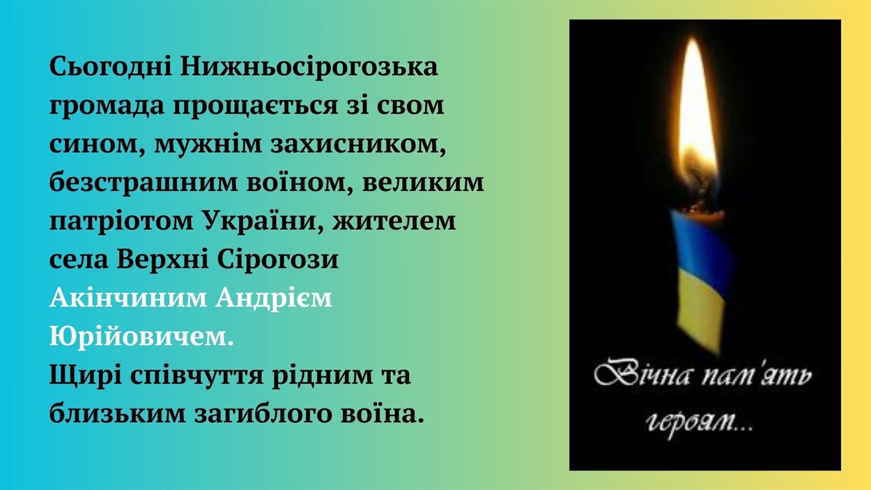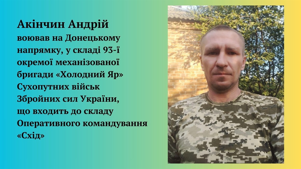Військовослужбовець 93‐ї ОМБр “Холодний Яр” Андрій Акінчин на позивний «Кім», родом з села Верхні Сірогози, що на Сірогозщині, загинув виконуючи бойове завдання 26 жовтня 2024 року під населеним пунктом Андріївка Бахмутського району Донецької області. Герою навіки залишилося 42 роки…