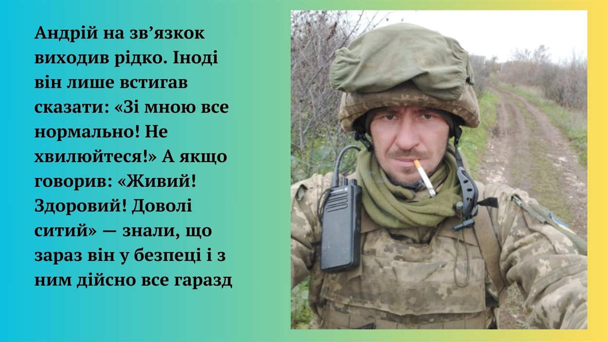 …Андрій на зв’язкок виходив рідко. Зазвичай розмова була дуже короткою, бо росіяни прослуховували телефонні розмови. Та й багато не розкажеш, якщо ти на “нулі” і під постійними обстрілами. Проте рідні раділи навіть таким коротким повідомленням від Андрія. Іноді він лише встигав сказати: “Зі мною все нормально! Не хвилюйтесь!” А якщо говорив: “Живий! Здоровий! Доволі ситий” — знали, що зараз він у безпеці і з ним дійсно все гаразд.