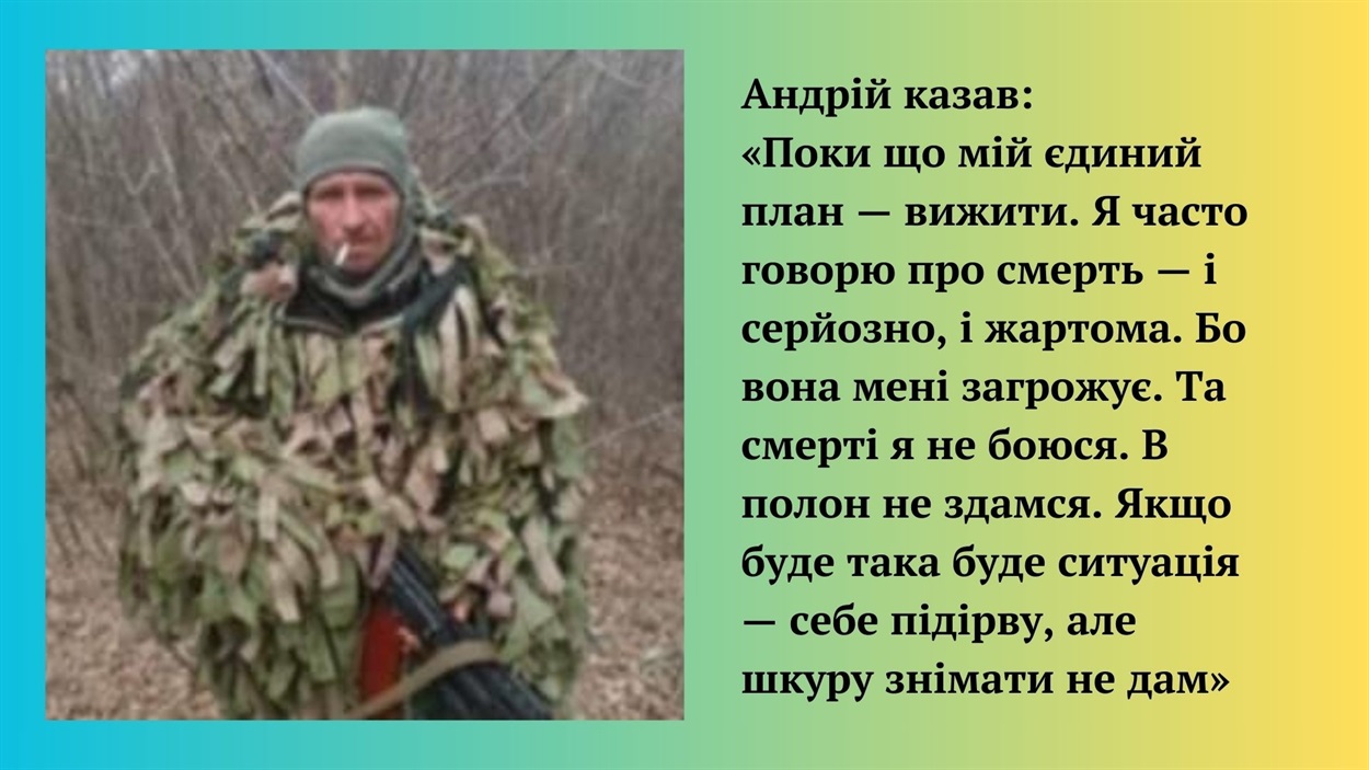 — Андрій казав: “Поки що мій єдиний план — вижити. Я часто говорю про смерть — і серйозно, і жартома. Бо вона мені загрожує. Та смерті я не боюся. В полон не здамся. Якщо буде така буде ситуація — себе підірву, але шкуру знімати не дам”, — пригадує розмови з братом Юлія.