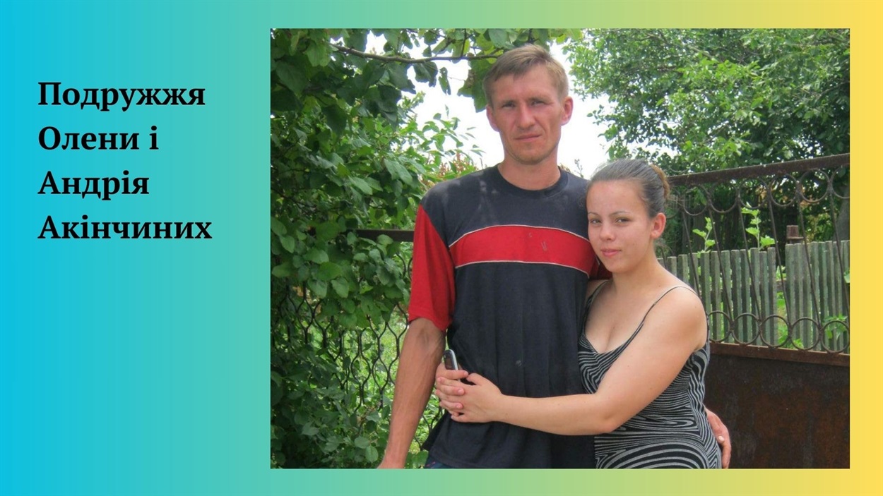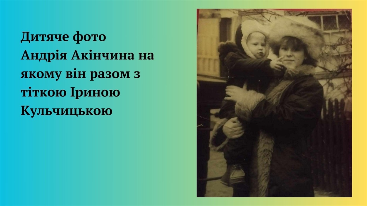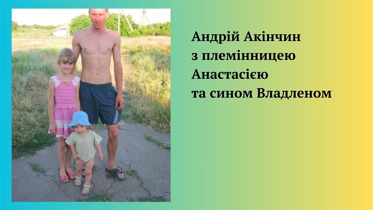 — Андрій декілька днів оббивав порог воєнкомату, стояв у довжелезній черзі разом з такими ж охочими піти на фронт. Кажуть, що у перші дні вторгнення українська армія поповнилася на понад 700 тисяч добровольців. Андрію відмовили, бо він взагалі не мав досвіду військової служби. Свого часу, його визнали непридатним до строкової служби, через проблеми зі здоров’ям. Ще у шкільні роки брат потрапив у аварію, у нього була складна травма ноги, також вже коли він працював — травмував око. Однак Андрій був вмотивований і рішуче налаштований, тож усіма правдами і неправдами він добився, щоб його мобілізували, — згадує про події перших днів війни сестра Андрія Акінчина Юлія Хлєбнікова.
