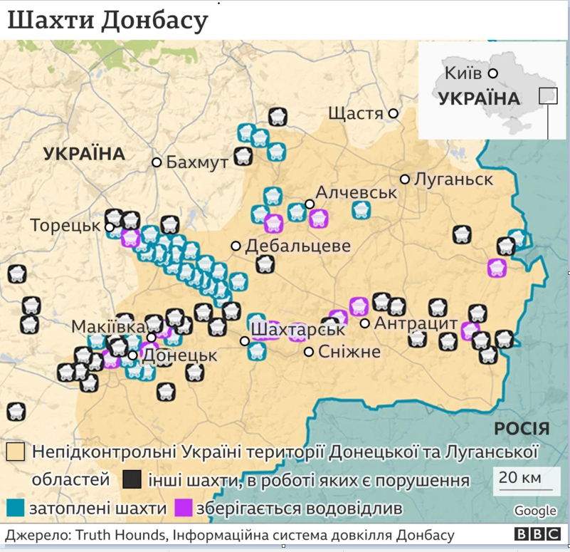 Особливістю шахт даного регіону є те, що багато з них поєднані гідрологічними зв’язками під землею, зокрема, ті шахти, що знаходяться по різні боки лінії фронту. Наприклад, шахта “Південна” (м. Торецьк), де зараз точаться інтенсивні бої і шахта імені Гагаріна (м. Горлівка — непідконтрольна територія).
