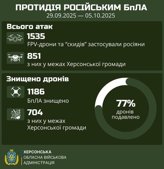 Як повідомлялося раніше, війська РФ за тиждень з 22 по 28 вересня 2025 року запустили по Херсонщині майже 2,3 тисячі дронів, 81% з них знищені українськими захисниками.