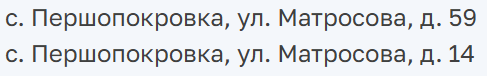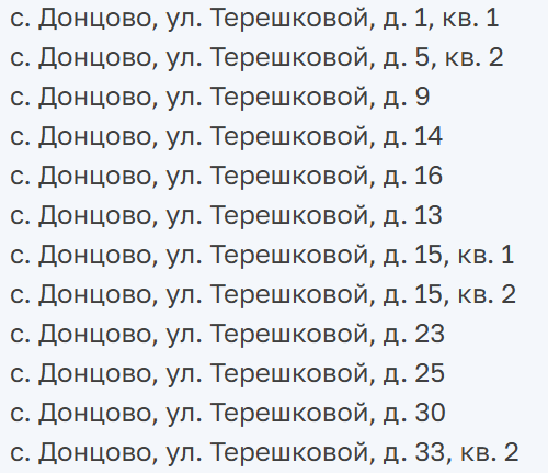 Це 12 будинків в с. Донцово по вулиці Українській (Терешкової) та 2 будинка в с. Першопокровка по вул. Українській (Матросова).