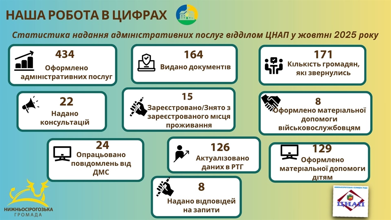 У жовтні 2025 року релокований Центр надання адміністративних послуг Нижньосірогозької селищної ради продовжив свою роботу, спрямовану на забезпечення мешканців громади якісними та доступними адміністративними послугами.