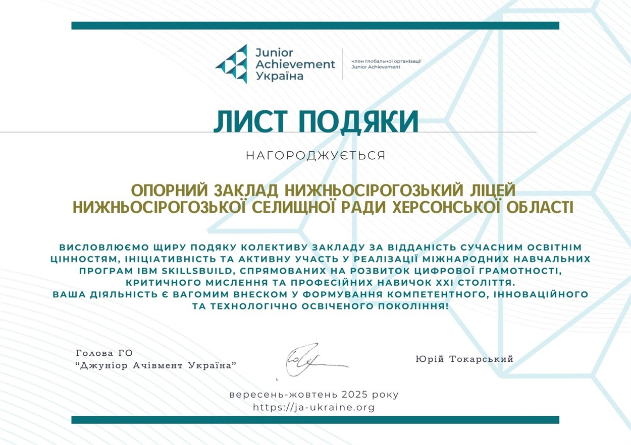 Штучний інтелект — це вже не майбутнє, а сьогодення. І українські школярі впевнено крокують у цей новий світ! Протягом двох місяців учні та педагоги з усієї країни занурювалися у сферу цифрових технологій разом із платформою IBM SkillsBuild у межах конкурсу “Навчання, що дарує призи”, організованого JA Україна. Серед тих, хто прийняв цей виклик — Нижньосірогозький ліцей, команда якого не лише опанувала курс “Штучний інтелект на практиці”, а й довела: сучасна освіта може бути захопливою і корисною.