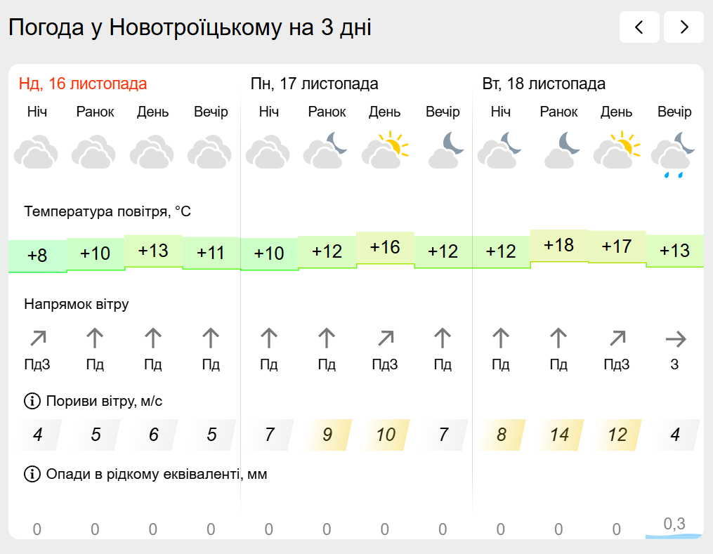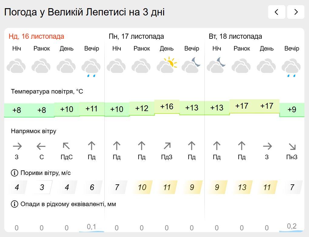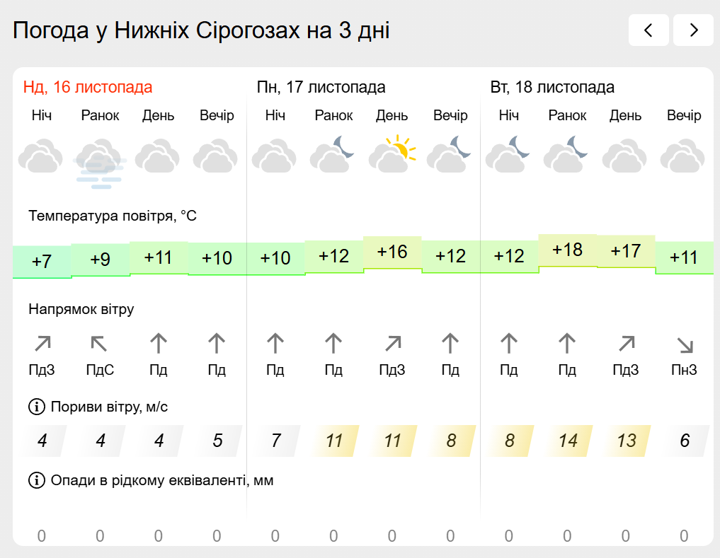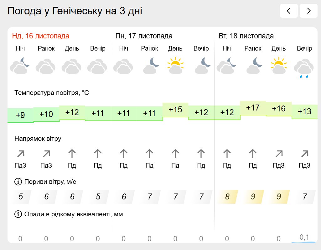 За інформацією Українського гідрометеорологічного центру прогноз погоди в населених пунктах лівобережної Херсонщини: Генічеську, Горностаївці, Великій Лепетисі, Верхньому Рогачку, Нижніх Сірогозах, Новотроїцькому на найближчих три дні.
