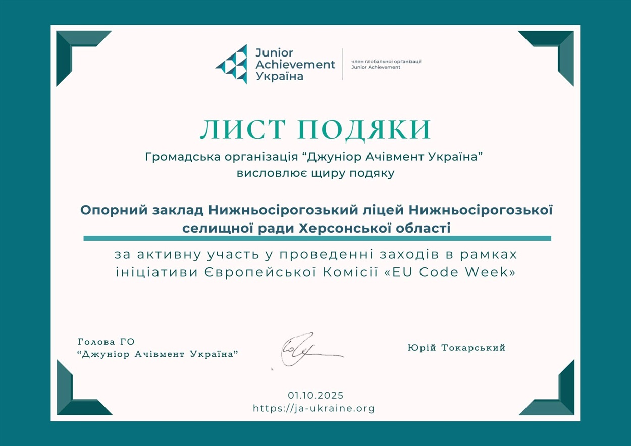 Протягом двох тижнів (11 – 26 жовтня) учні й педагоги Опорного закладу Нижньосірогозький ліцй брали участь у Челенджі EU Code Week 2025 під гаслом “Покращуйте цифрові навички разом із нами!”