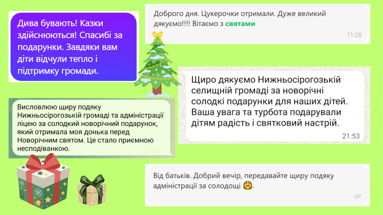На адресу місцевих органів влади Сірогозщини та освітніх закладів надійшли SMS-повідомлення і телефонні дзвінки від школярів та їх батьків зі словами вдячності за теплі привітання і подарунки до зимових свят.