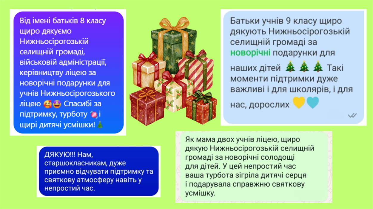 Теплі слова підтримки пролунали і від освітян. В адміністрації Опорного закладу “Нижньосірогозький ліцей” зазначили, що щиро вітають своїх учнів із новорічно-різдвяними святами та бажають, аби в їхніх домівках панували тепло, радість і надія. У ліцеї наголошують: де б сьогодні не перебували діти, вони завжди залишаються частиною великої ліцейної родини, яку об’єднує віра в Перемогу та повернення до мирного життя в рідній громаді.