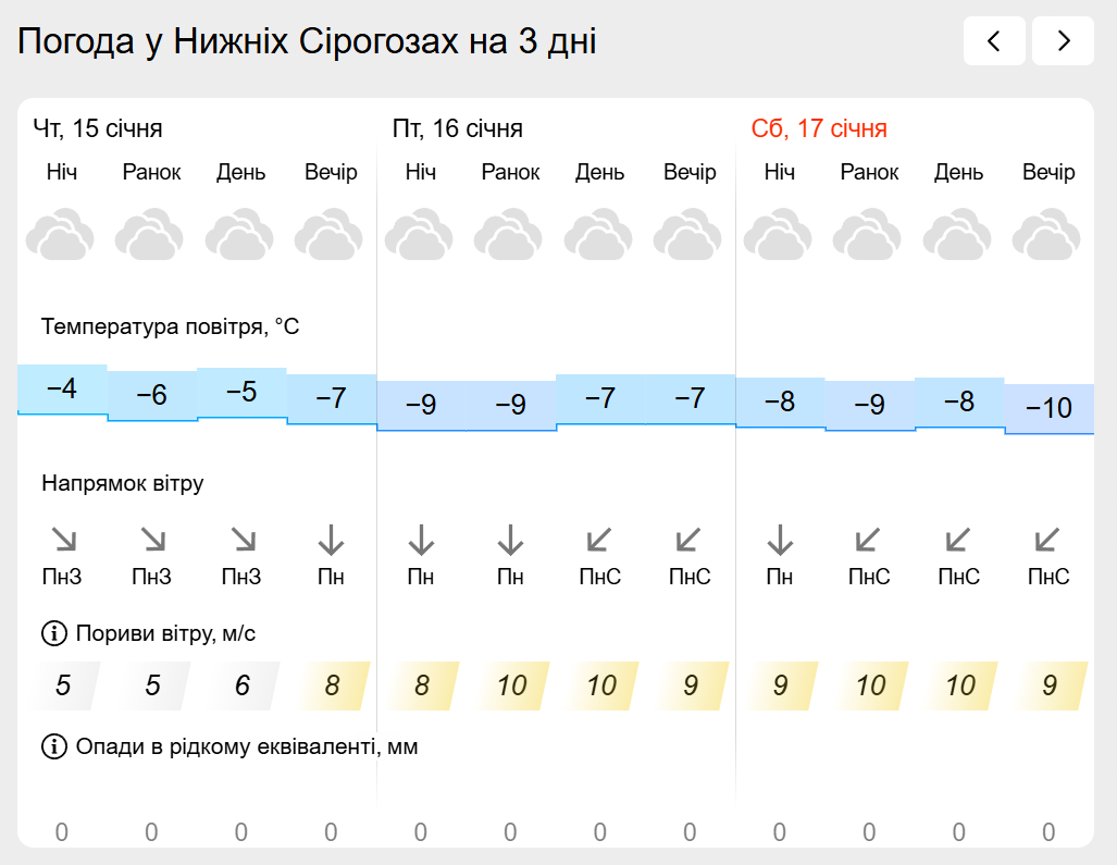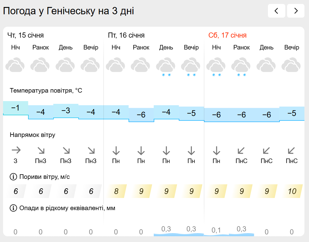 За інформацією Українського гідрометеорологічного центру прогноз погоди в населених пунктах лівобережної Херсонщини: Генічеську, Горностаївці, Великій Лепетисі, Верхньому Рогачку, Нижніх Сірогозах, Новотроїцькому на найближчих три дні.