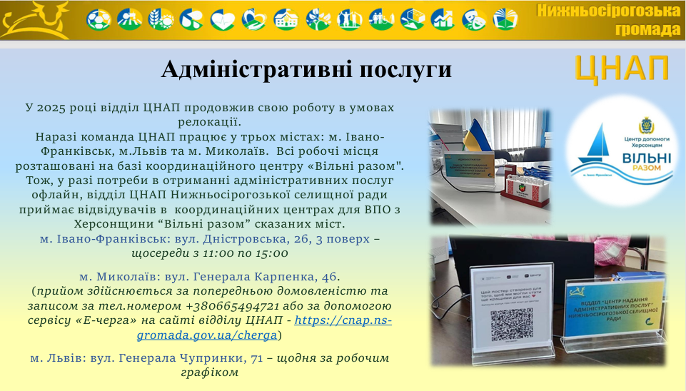 У жовтні 2023 року було відновлено роботу релокованого Центру надання адміністративних послуг Нижньосірогозької селищної ради. У 2025 році адміністратори ЦНАП працювали у трьох містах — Івано-Франківську, Львові та Миколаєві — на базі координаційних центрів “Вільні разом”, забезпечуючи доступ до адміністративних послуг для мешканців громади та внутрішньо переміщених осіб.
