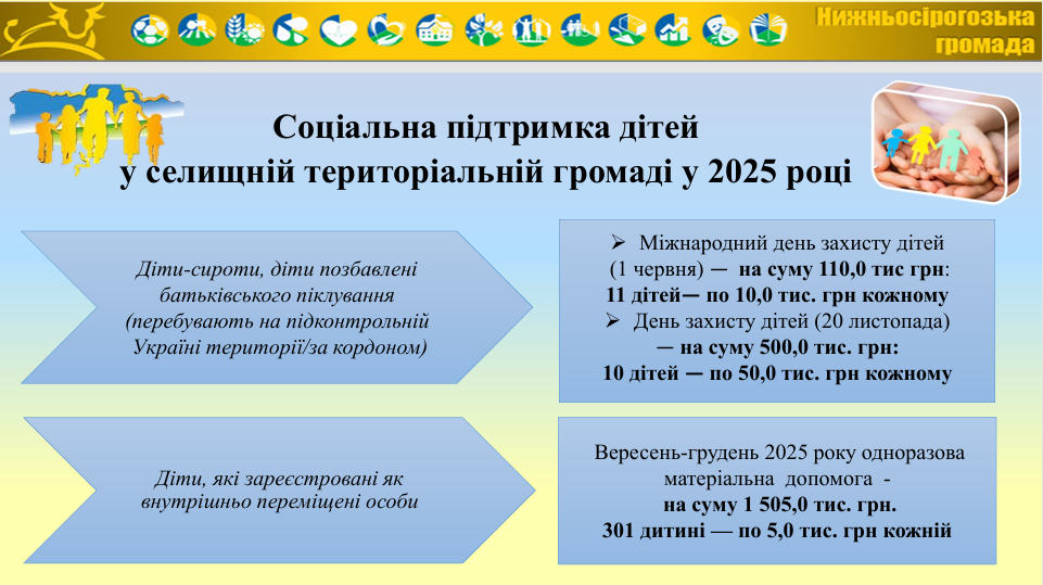 У громаді реалізовувалися 4 місцеві програми соціального спрямування, які передбачають додаткові соціальні гарантії та матеріальну допомогу за кошти бюджету громади. Програми були актуалізовані відповідно до реальних потреб. Також затверджено нові порядки надання допомоги дітям-сиротам, дітям без батьківського піклування та дітям з числа ВПО. Окремо ухвалено програму підтримки дітей на 2026 рік із передбаченим фінансуванням.