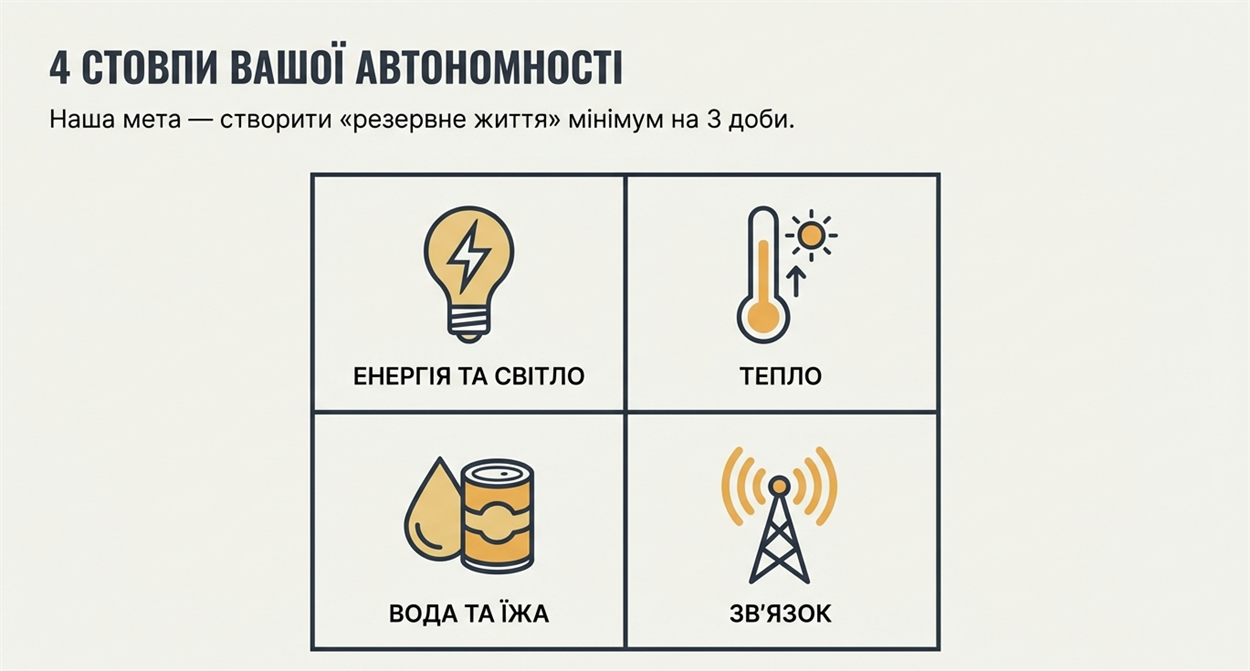 Перед вимкненням: зарядіть усі пристрої до 100 %, поповніть запаси води та дізнайтеся адресу найближчого Пункту незламності.
