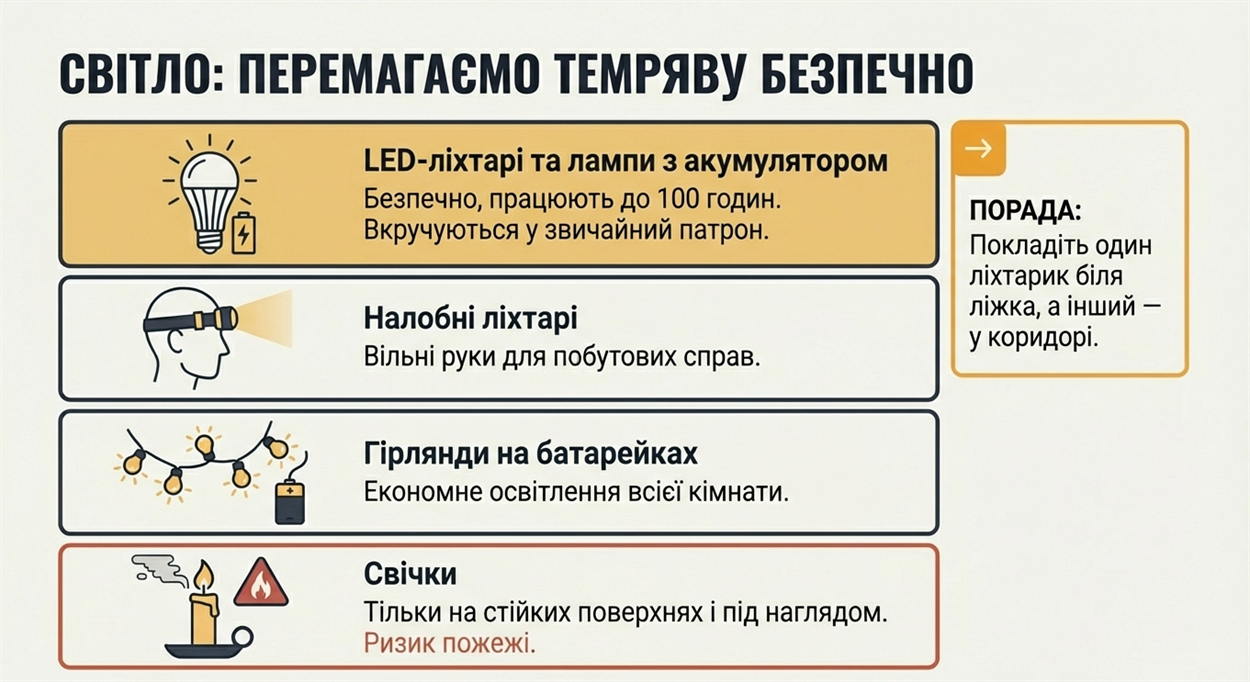 Енергія та світло: обов’язково майте мінімум два павербанки (бажано ємністю 20 000 мА·год), LED-ліхтарики (ручні або налобні) та лампи з акумуляторами. Для освітлення великих кімнат безпечно використовувати гірлянди на батарейках, а свічки — лише на стійких поверхнях під наглядом.