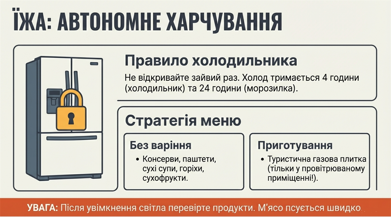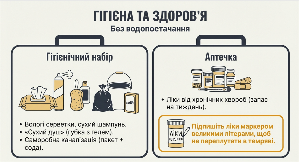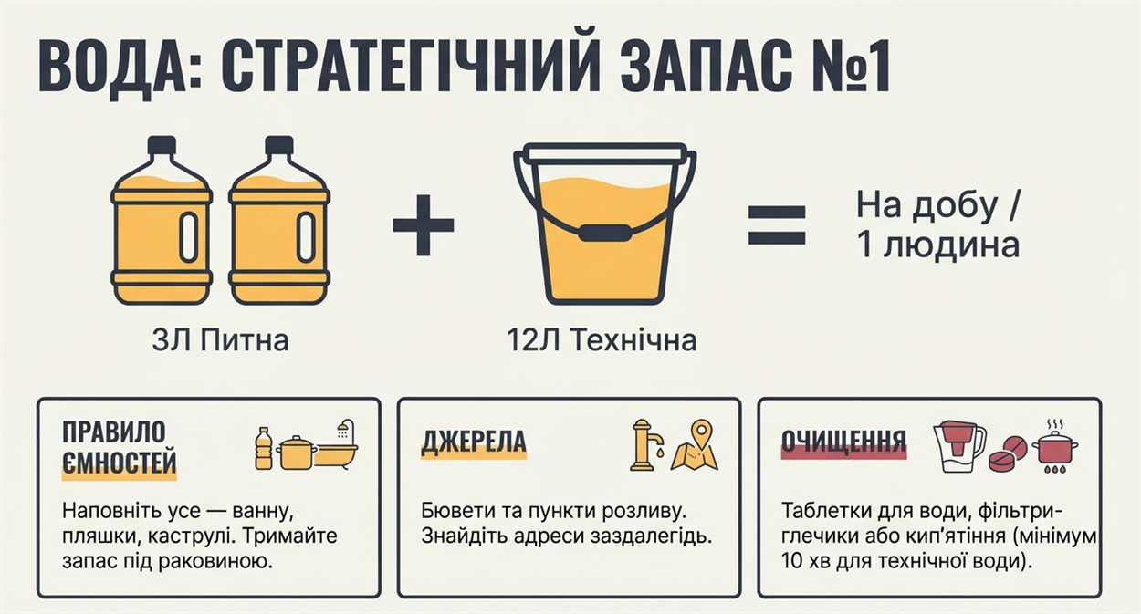 Запас води: розраховуйте на 3 літри питної води на людину на добу та ще 10–12 літрів технічної для гігієни. Заздалегідь наповніть ванну, пляшки та ємності під раковиною.
