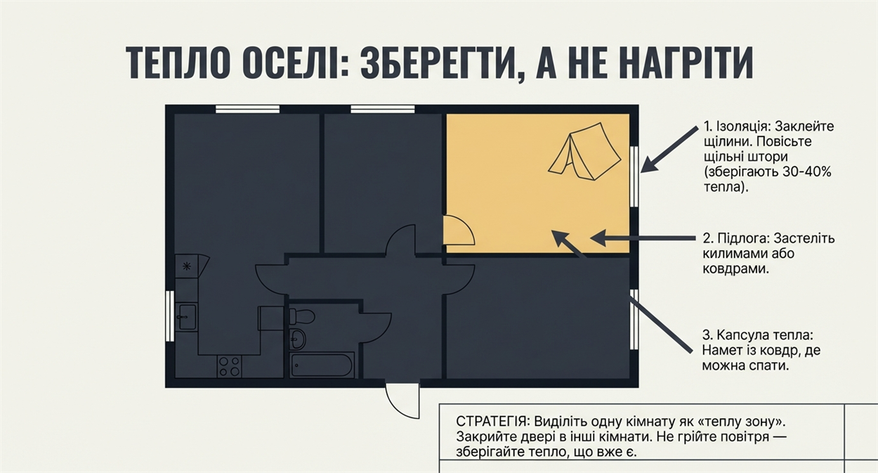 Утеплення приміщення: заклейте щілини у вікнах скотчем або рушниками, повісьте щільні штори — це зменшує втрати тепла на 30–40 %. Виберіть одну кімнату як “теплу зону” і закрийте двері в інші.