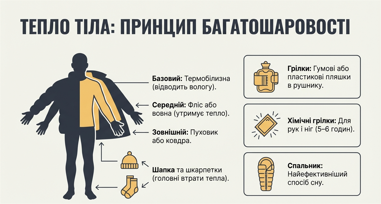 Одяг: використовуйте багатошаровість: термобілизна, фліс або вовна, а зверху — пуховик чи тепла кофта. Не забувайте про шапку та теплі шкарпетки навіть у квартирі.