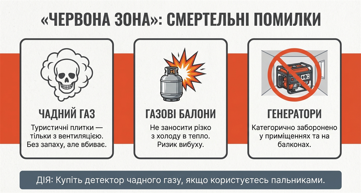 Генератори: їх дозволено встановлювати лише просто неба на відстані не менше 6 метрів від вікон та дверей; використання в приміщеннях чи на балконах смертельно небезпечне через чадний газ.