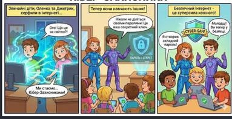 Окрему увагу приділили правилам безпечного користування гаджетами та культурі спілкування в цифровому середовищі. Також учні вчилися правильно формулювати запити у сервісі Gemini та застосовувати можливості штучного інтелекту для навчання. Результатом творчої роботи стало створення власного коміксу “Кібер – захисники”, у якому діти показали, як знання допомагають долати онлайн-загрози.