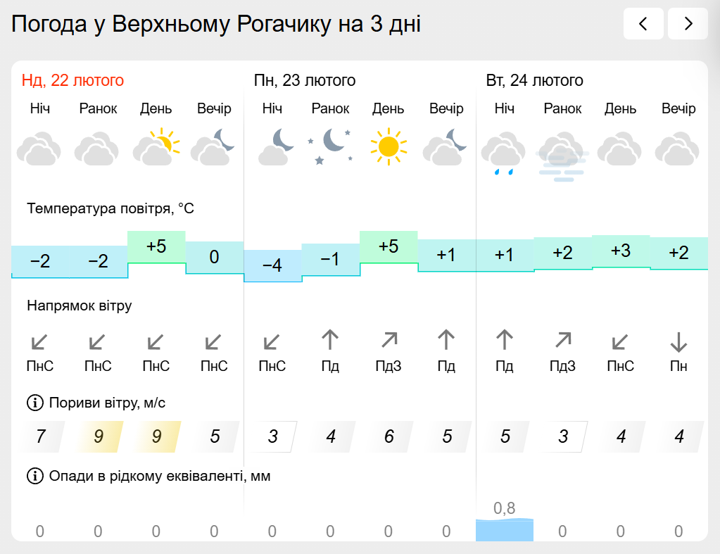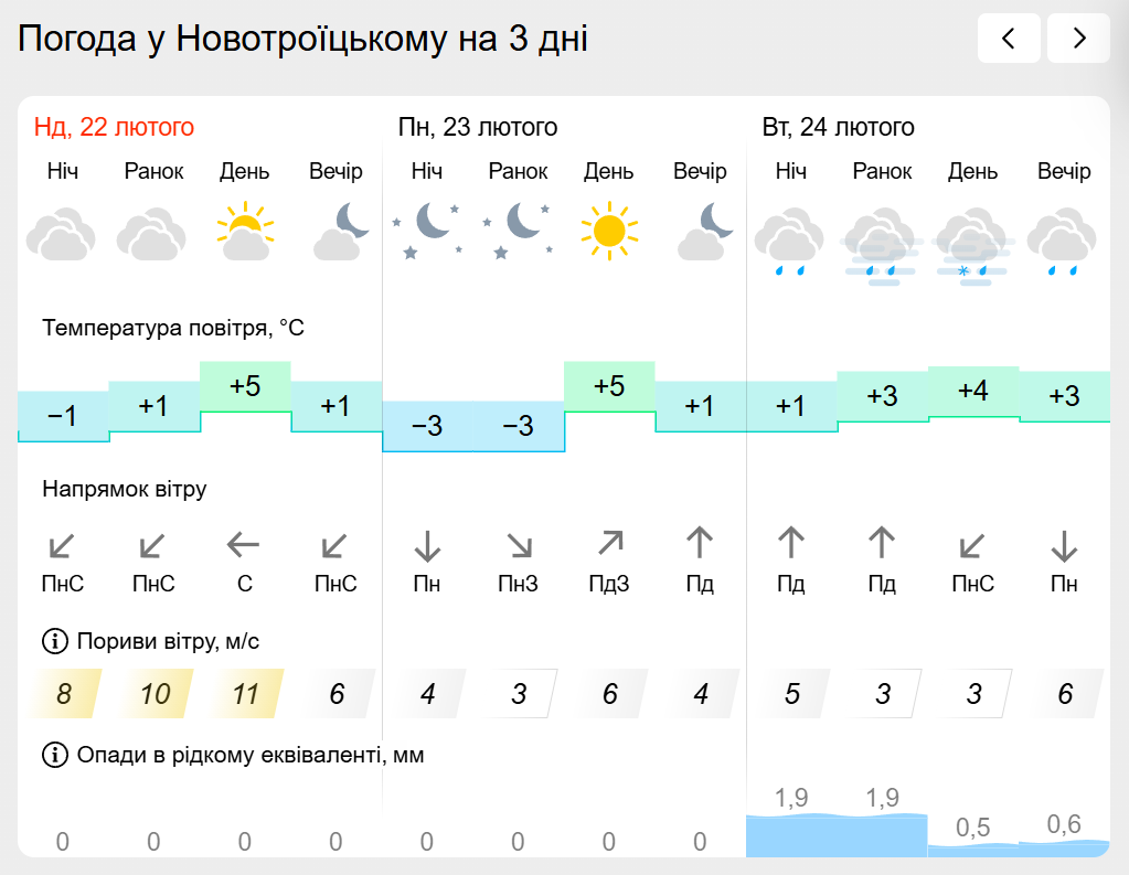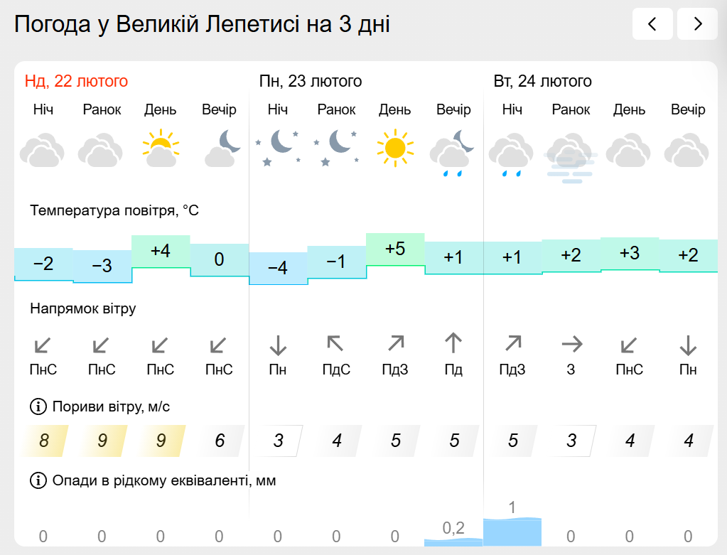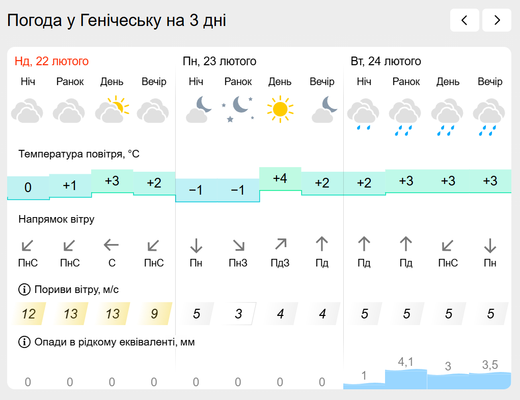 За інформацією Українського гідрометеорологічного центру прогноз погоди в населених пунктах лівобережної Херсонщини: Генічеську, Горностаївці, Великій Лепетисі, Верхньому Рогачку, Нижніх Сірогозах, Новотроїцькому на найближчих три дні.