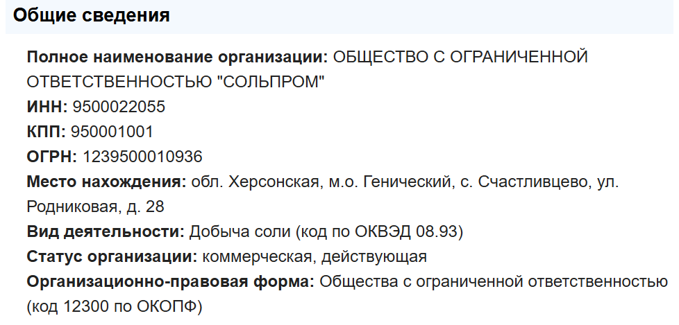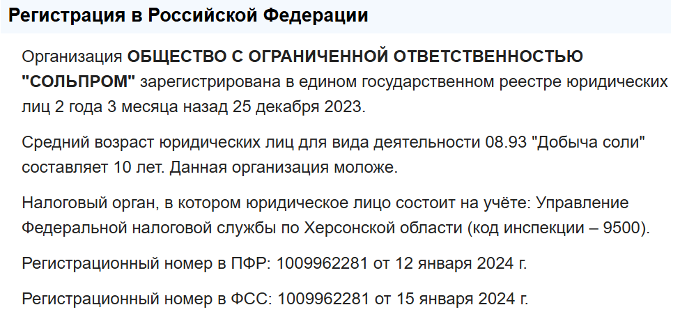 Реальний стан компанії-інвестора “Сольпром” (ІПН 9500022055) кардинально відрізняється від “монументальних” планів окупантів. Підприємство було зареєстровано лише наприкінці грудня 2023 року в селі Щасливцеве.