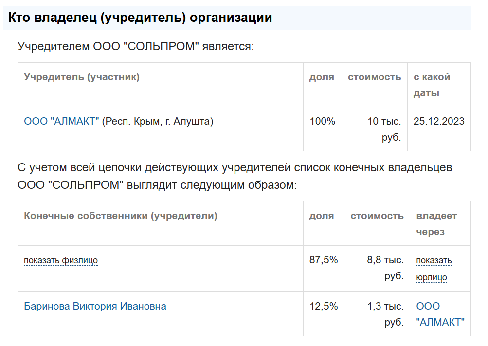 Директор “Сольпрому” Олексій Колячкін паралельно керує іншою структурою — “Трави Азова”, яка при виручці у 805 тисяч рублів сплатила лише 10 тисяч рублів податків. Це вказує на те, що “Сольпром” є лише формальним інструментом для легалізації мародерства.