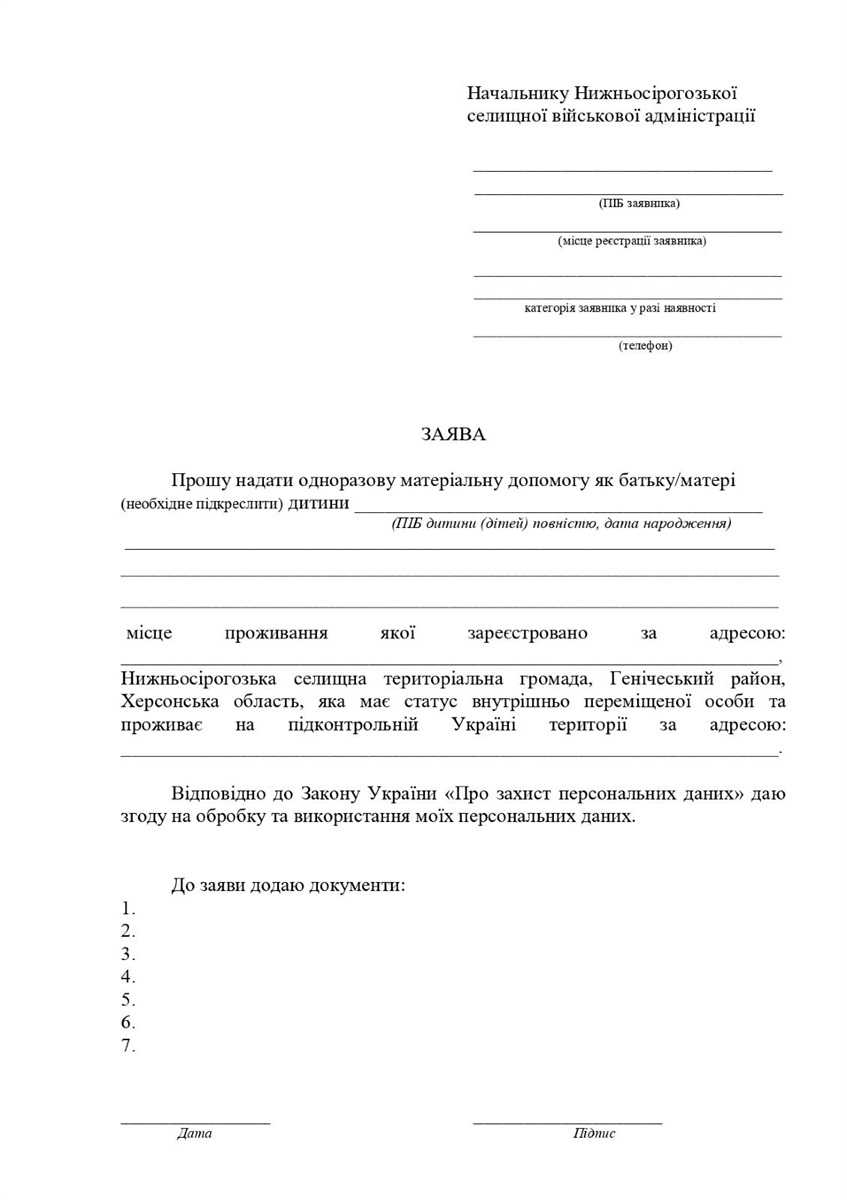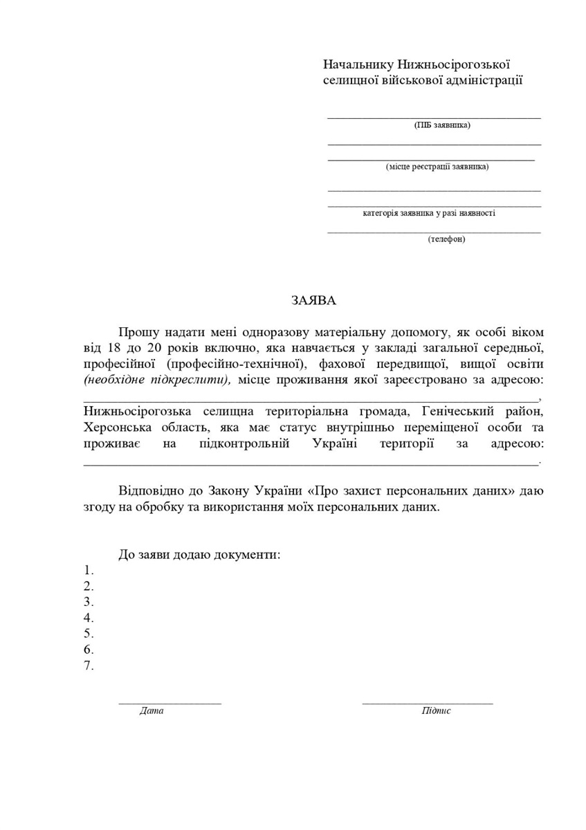 Заява про надання допомоги розглядається протягом: одного місяця з дня її надходження до Нижньосірогозької селищної військової адміністрації.