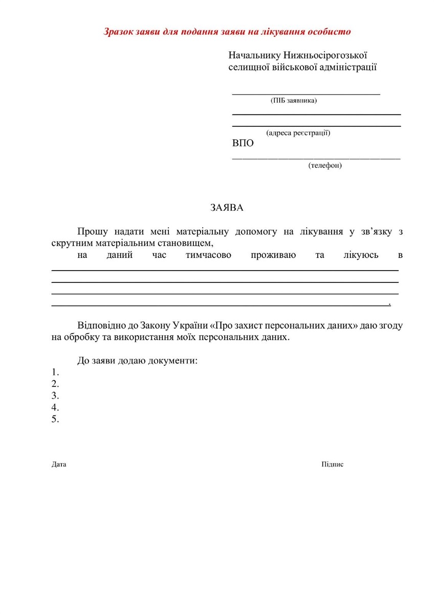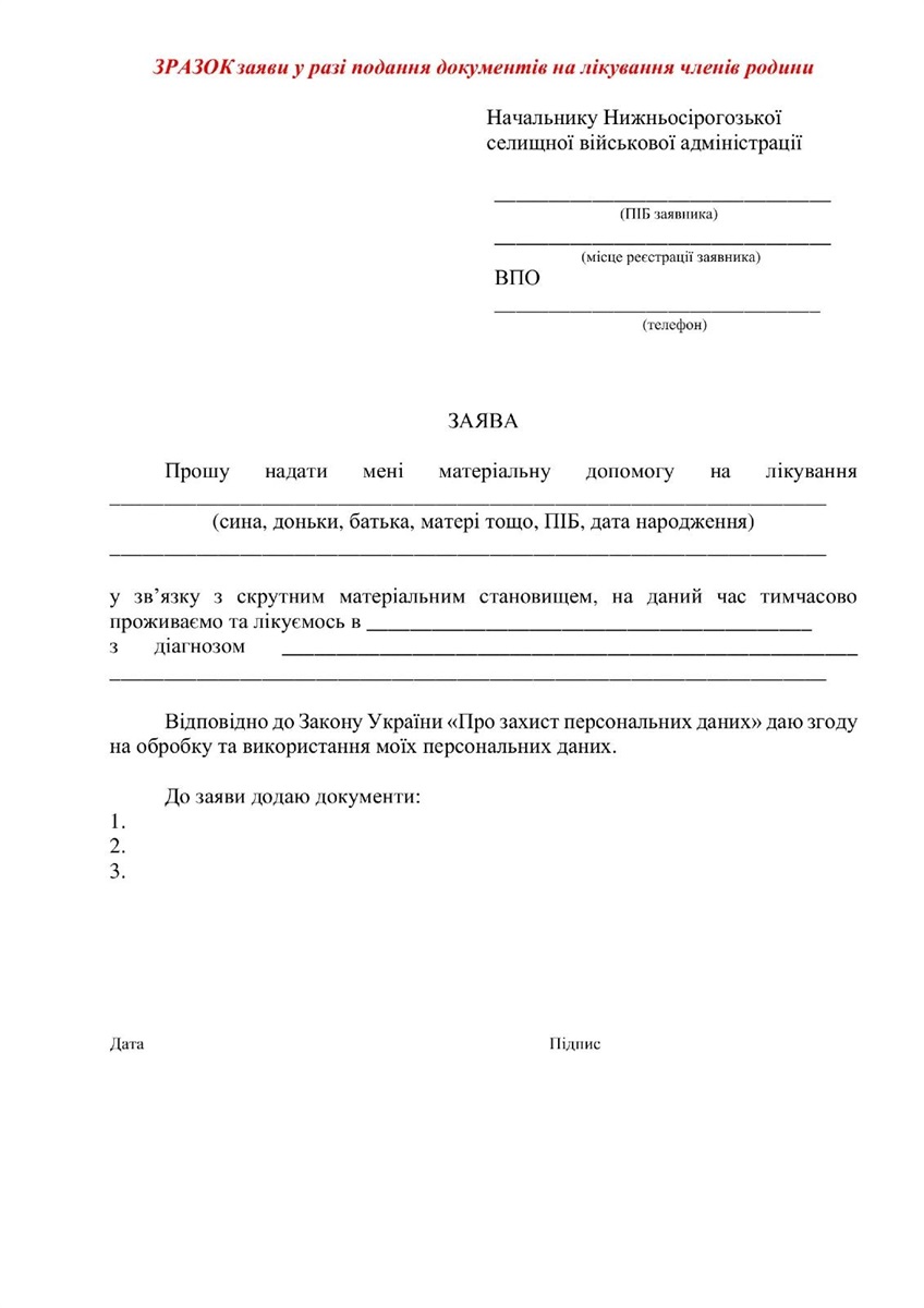 Заяву потрібно подати до Нижньосірогозької селищної військової адміністрації через відділ «Центр надання адміністративних послуг» (ЦНАП).