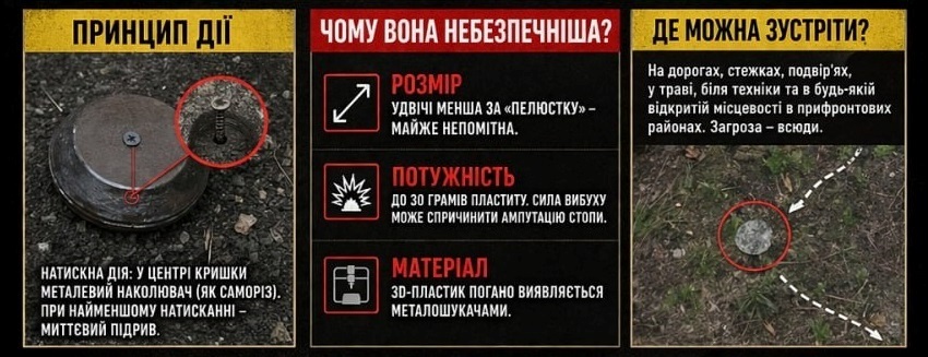 Поява такого типу мін означає новий рівень мінної небезпеки для України. Якщо раніше головною загрозою були серійні радянські або російські боєприпаси, конструкції яких добре відомі саперам, то тепер дедалі частіше доводиться мати справу з імпровізованими, модифікованими або кустарно виготовленими вибуховими пристроями, характеристики яких можуть змінюватися від партії до партії. Це ускладнює їх виявлення, знешкодження та прогнозування поведінки під час детонації.