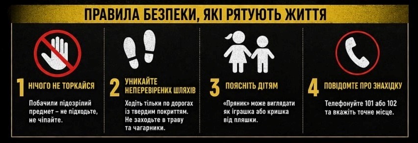 На тлі зростання випадків дистанційного мінування місцева влада та вибухотехнічні служби закликають мешканців прифронтових і деокупованих територій бути максимально обережними, не сходити з перевірених маршрутів, уникати відвідування лісосмуг, пустирів, узбереж і необстежених ділянок, а також негайно повідомляти про будь-які підозрілі предмети правоохоронцям або ДСНС.