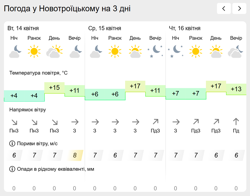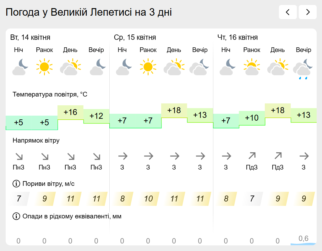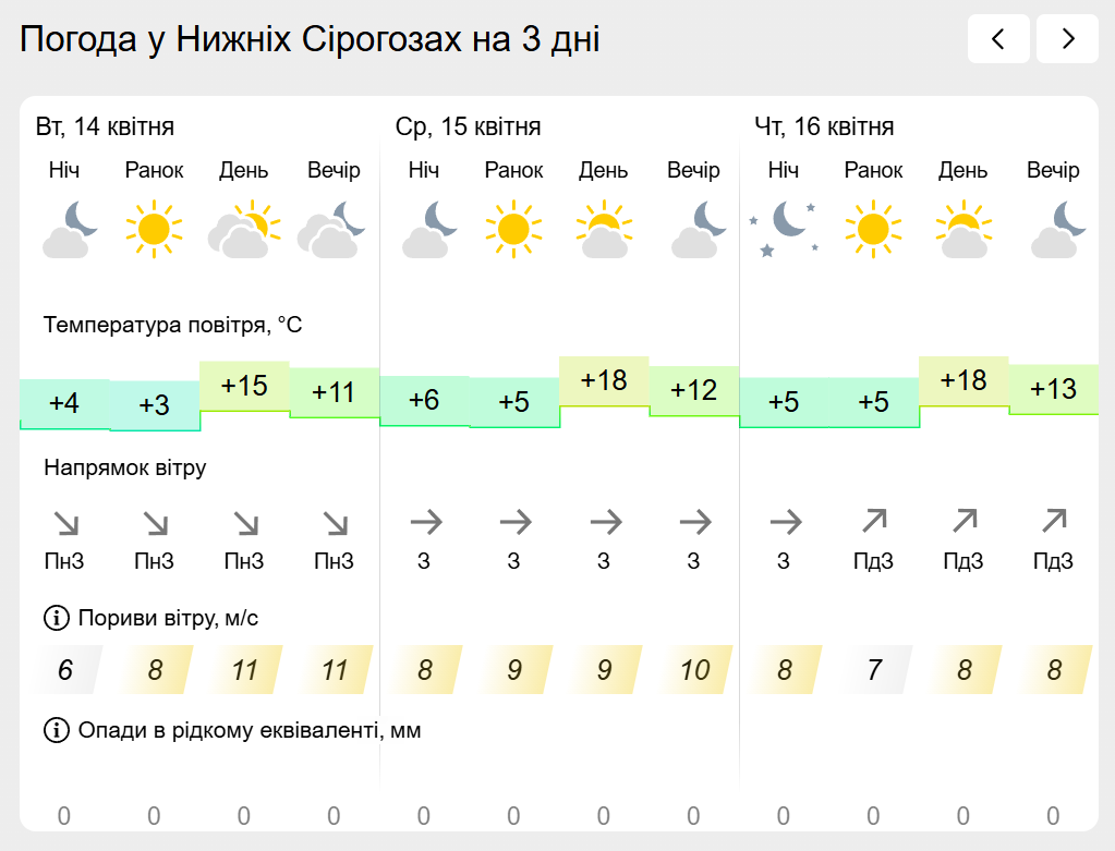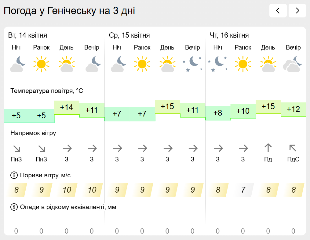 За інформацією Українського гідрометеорологічного центру прогноз погоди в населених пунктах лівобережної Херсонщини: Генічеську, Горностаївці, Великій Лепетисі, Верхньому Рогачку, Нижніх Сірогозах, Новотроїцькому на найближчих три дні.