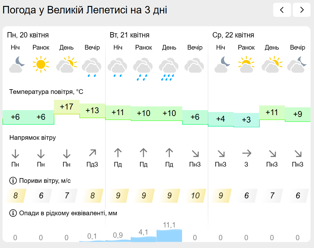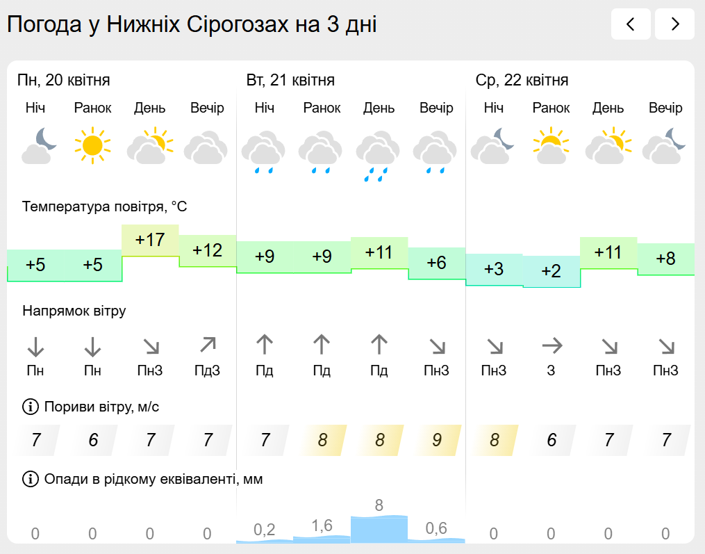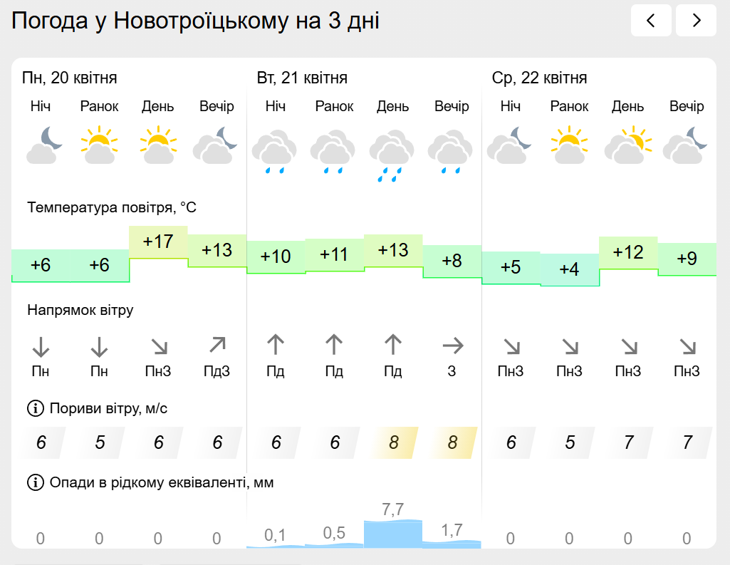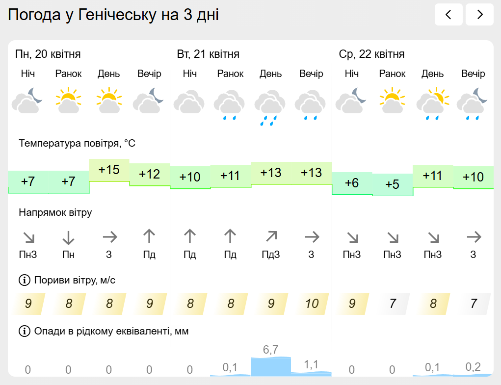 За інформацією Українського гідрометеорологічного центру прогноз погоди в населених пунктах лівобережної Херсонщини: Генічеську, Горностаївці, Великій Лепетисі, Верхньому Рогачку, Нижніх Сірогозах, Новотроїцькому на найближчих три дні.