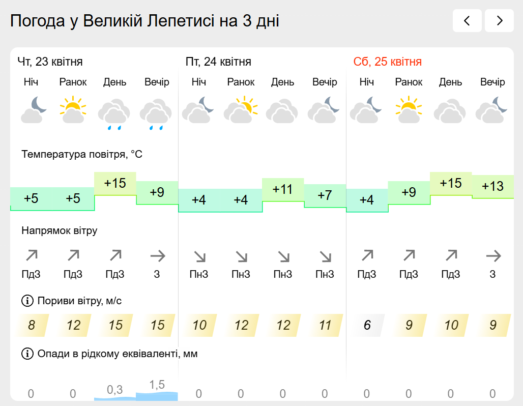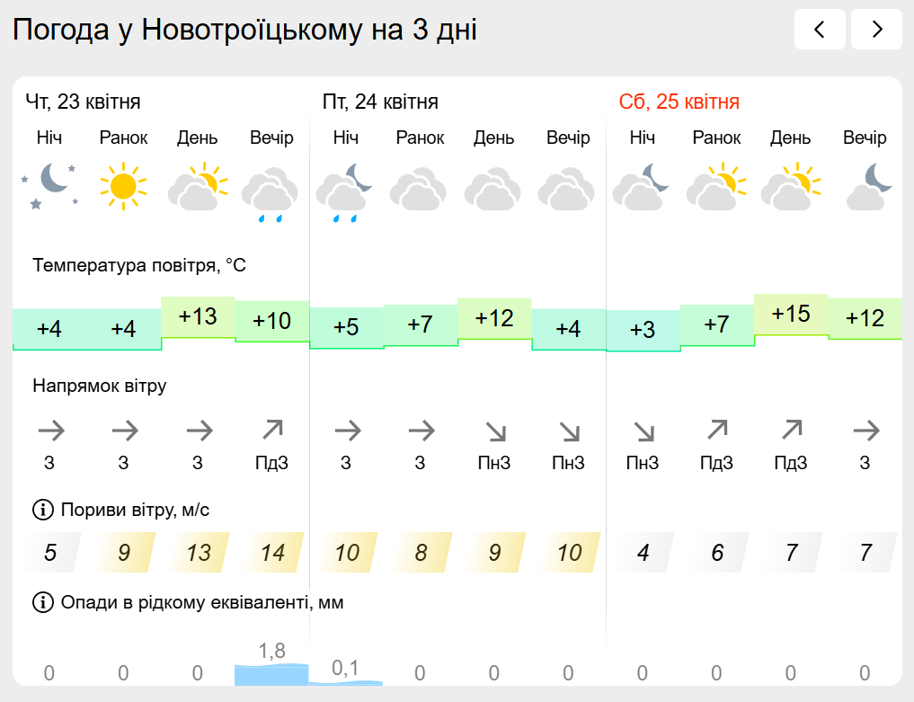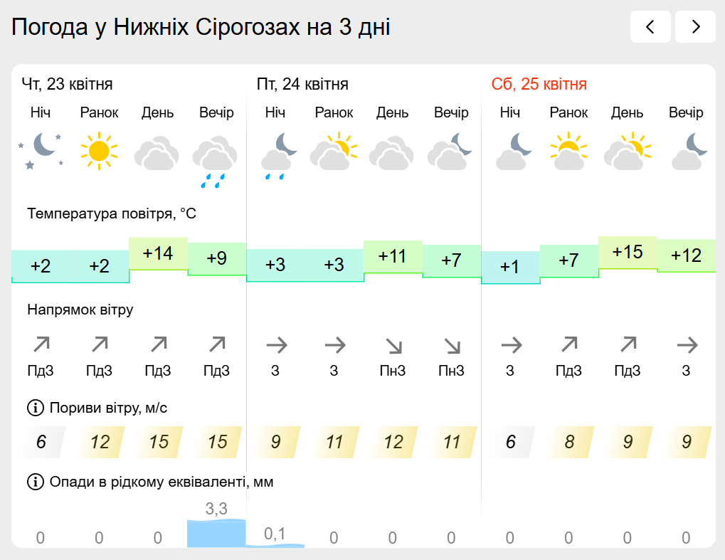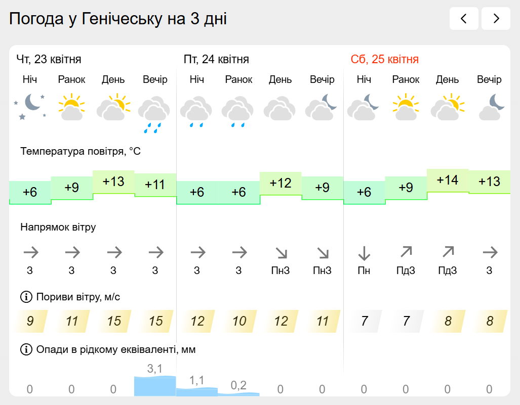 За інформацією Українського гідрометеорологічного центру прогноз погоди в населених пунктах лівобережної Херсонщини: Генічеську, Горностаївці, Великій Лепетисі, Верхньому Рогачику, Нижніх Сірогозах, Новотроїцькому на найближчих три дні.