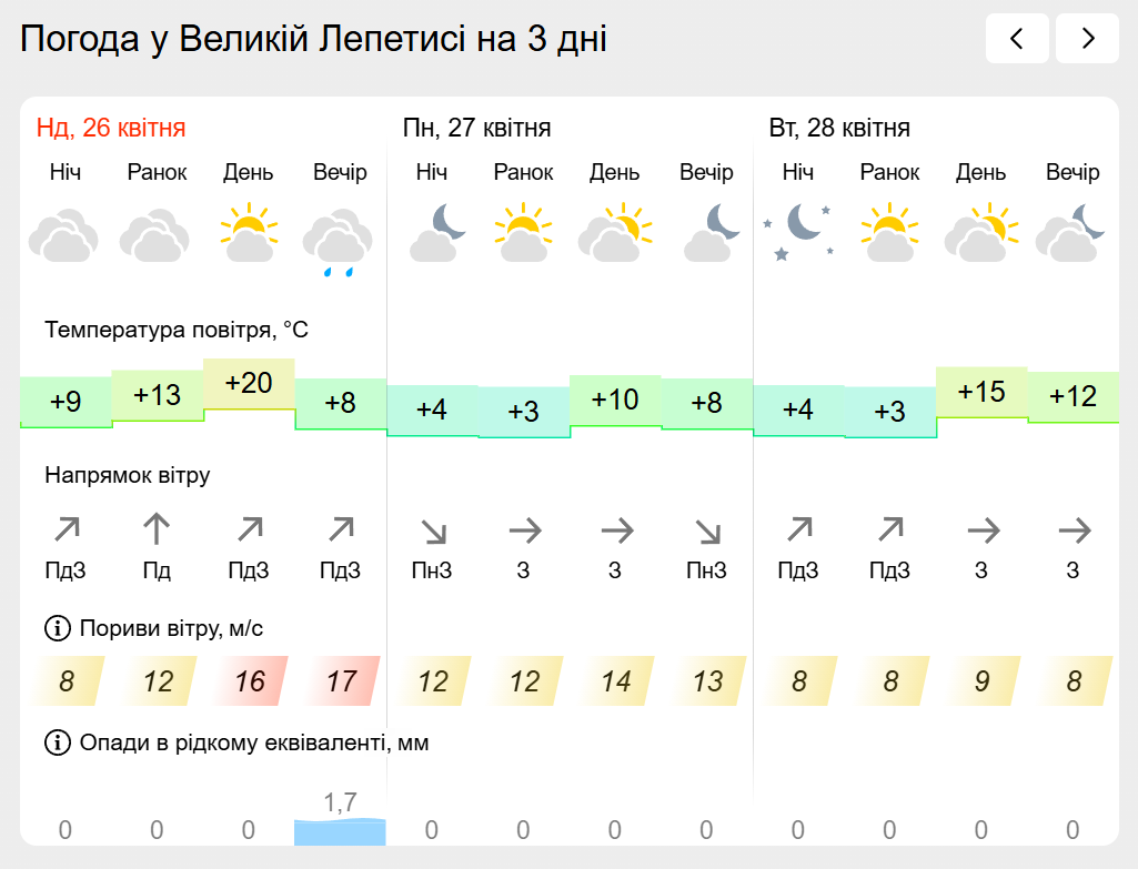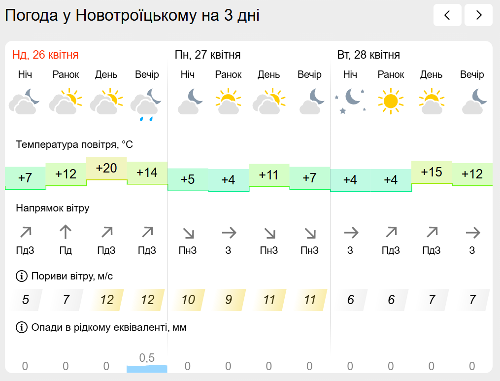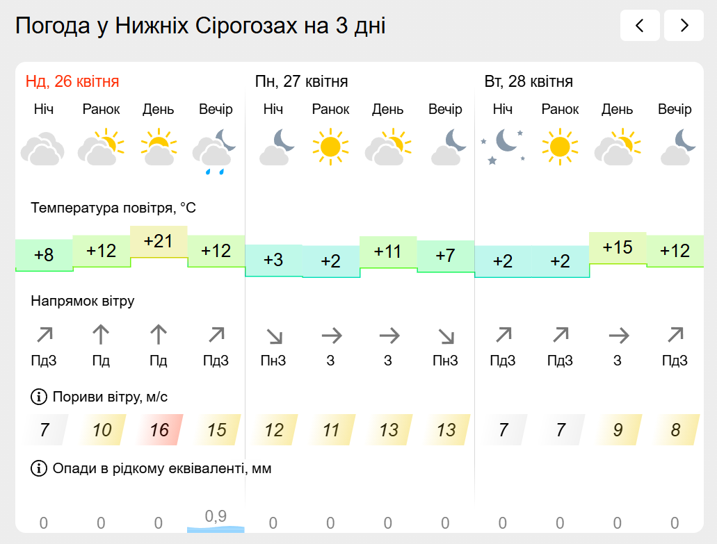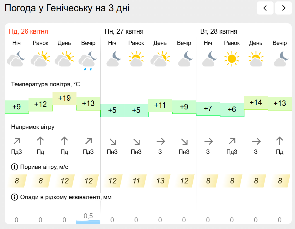 За інформацією Українського гідрометеорологічного центру прогноз погоди в населених пунктах лівобережної Херсонщини: Генічеську, Горностаївці, Великій Лепетисі, Верхньому Рогачку, Нижніх Сірогозах, Новотроїцькому на найближчих три дні.