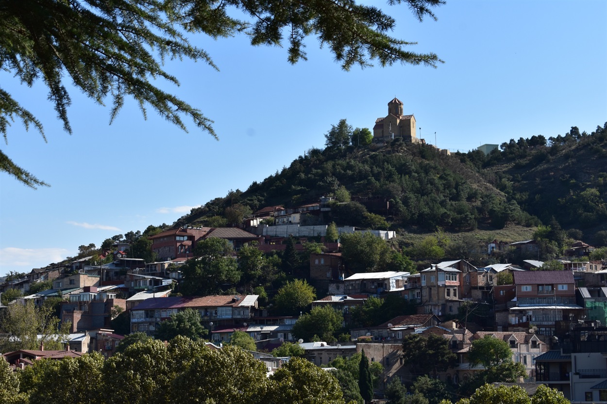 Тбілісі. Вдалині - храм Миколи Чудотворця всередині фортеці Нарікала на горі Мцатмінда