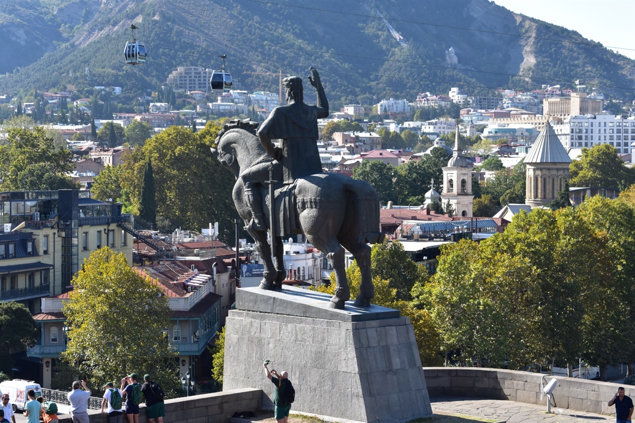 Тбілісі. Пам'ятник засновнику Тбілісі Вахтангу Горгасалі височіє на скелі на березі річки Кури поруч з храмом Метехі