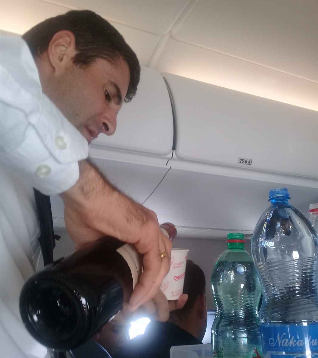 З грузинською гостинністю довелося зіткнутися вже на борту літака. Стюарти (а не стюардеси, як ми звикли!) роздали ланч-бокси з обідом і пропонували випити по келиху червоного Кінзмараулі або білого Сапераві, проголошуючи при цьому тости. Не хочете вина — тоді скуштуйте знамениті лимонади Лагідзе: тархун, дюшес, лимон, або не менш відомі грузинські мінеральну воду, чай, каву.