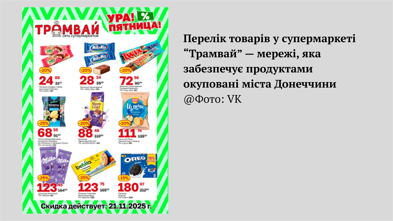 Мережа супермаркетів “Трамвай”з’явилися тут якраз після 2022 року. У Донецьку з’явились близько 7 точок цієї мережі, а у Макіївці та Єнакієво — по одному магазину, але планують відкривати ще, пише видання Бахмут.in.ua. Тут продають товари відомих світових брендів, як, наприклад, товарів групи компанії Mondelez International: шоколад Milka, Tobleron чи печиво Oreo. Нагадаємо, що з російського ринку Mondelez International не вийшли, хоча раніше зобов'язалися скоротити свою присутність у Росії. Водночас зобов'язання усе ще не виконали, і попри високі податки Mondelez все ще продається на полицях супермаркетів РФ, пише Bloomberg. Але є у Донецьку й локальні продукти місцевих виробників.