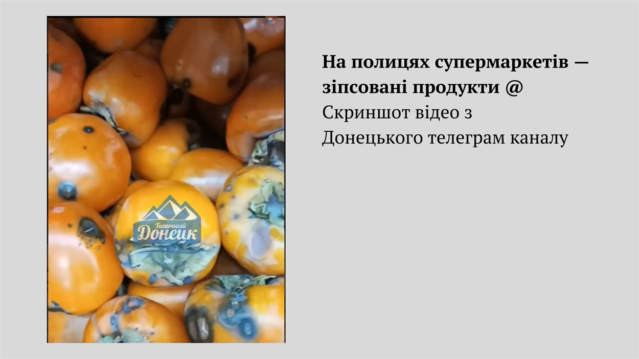 У результаті місцевий ринок продуктів переорієнтувався на “сірі” схеми: 60–70% постачання йде через Крим (анексований у 2014 році), Ростовську область РФ або навіть Туреччину — для фруктів і овочів.