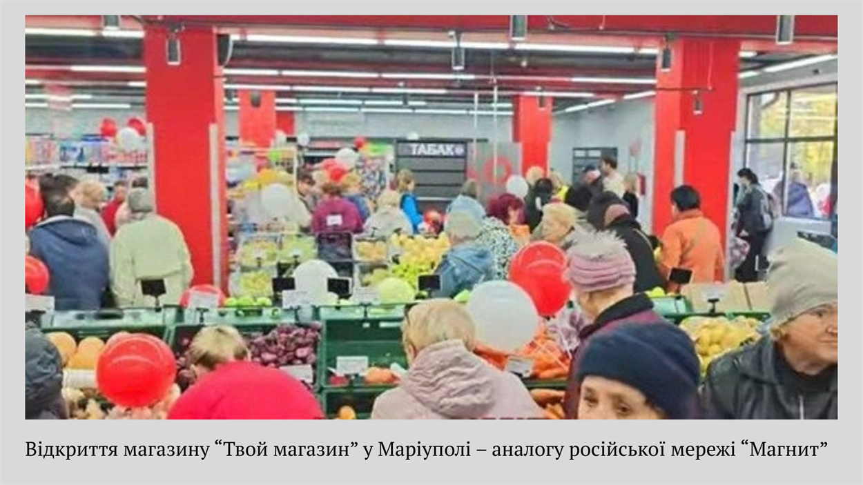 На місці зруйнованих українських супермаркетів з’явилися аналоги відомих російських мереж — “Пятёрочка”, “Магнит”, “Мега”.