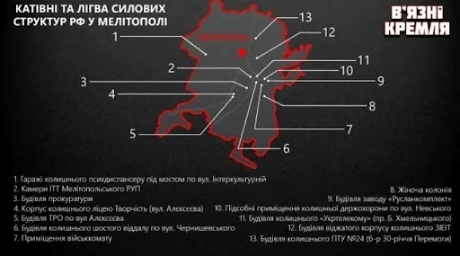 Журналісти РІА Південь на основі інтерв'ю з полоненими, яких депортували, і тими, кому вдалося самостійно виїхати з окупації, склали карту місць ув'язнення цивільних в'язнів, створених окупантами в Мелітополі.