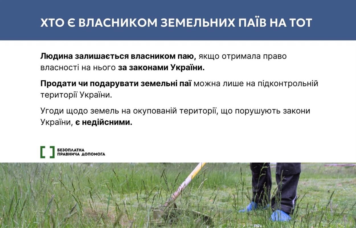 Українське законодавство гарантує право власності на земельні паї, навіть якщо вони розташовані на тимчасово окупованій території. Власники таких земельних ділянок не втрачають своїх прав, а держава забезпечує їхній правовий захист. Якщо у вас виникли питання щодо прав власності на паї, ви можете скористатися безоплатною правничою допомогою.