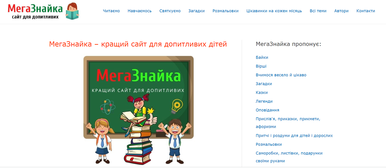 “МегаЗнайка” — сайт для дітей та батьків, для вчителів початкових класів та вихователів дитячих садочків. На ньому зібрана величезна кількість цікавої і корисної інформації: казки, вірші, ігри, пісні, цікаві факти про різноманітні предмети та явища, про рослинний і тваринний світ, про людину та її діяльність.
