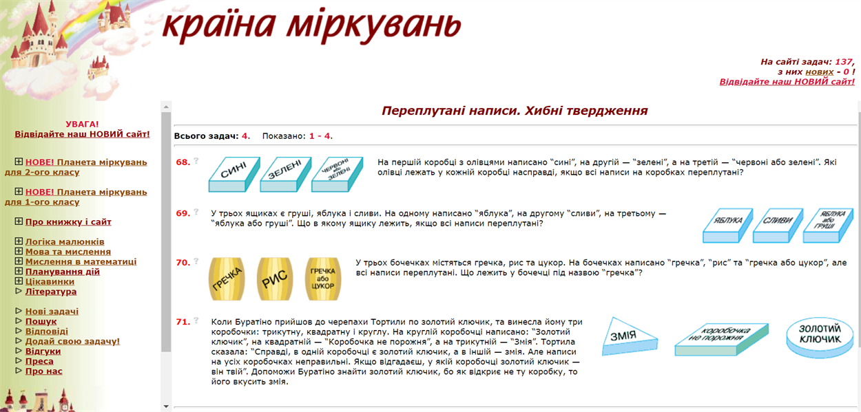 “В країні міркувань” http://www.mysl.lviv.ua/ — сайт присвячений розвитку мислення дітей 6 –12 років. Він містить велику кількість різнопланових завдань, які спрямовані на розвиток у молодших школярів основних операцій та прийомів мислення, просторової уяви, уваги і пам'яті. Чимало завдань потрібно вирішувати разом з казковими героями та персонажами улюблених дитячих книжок.